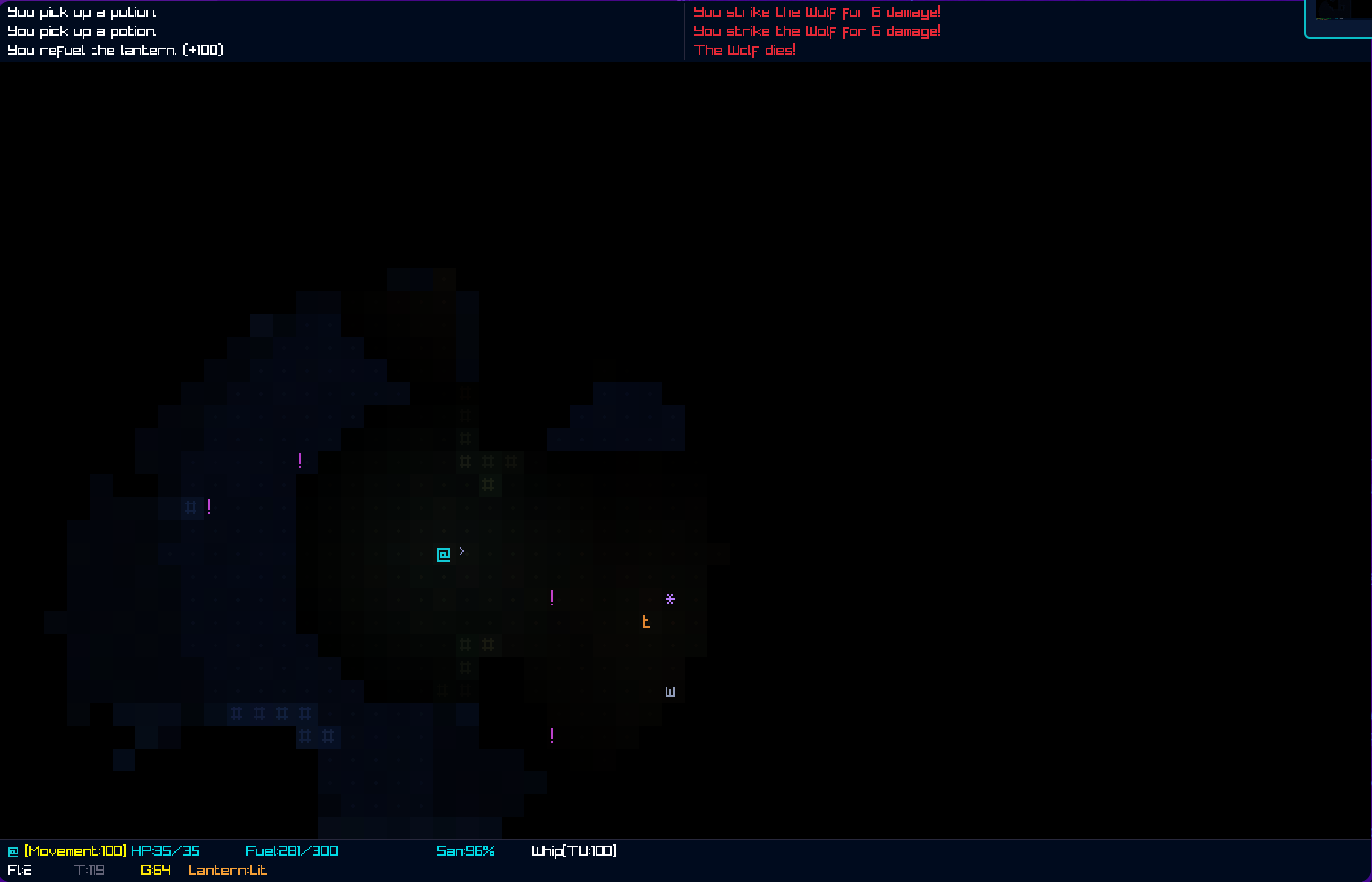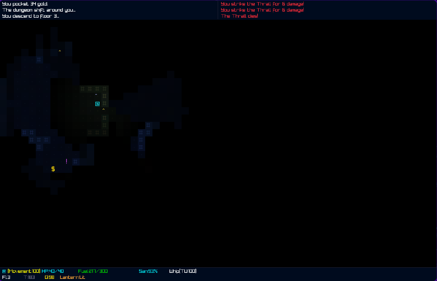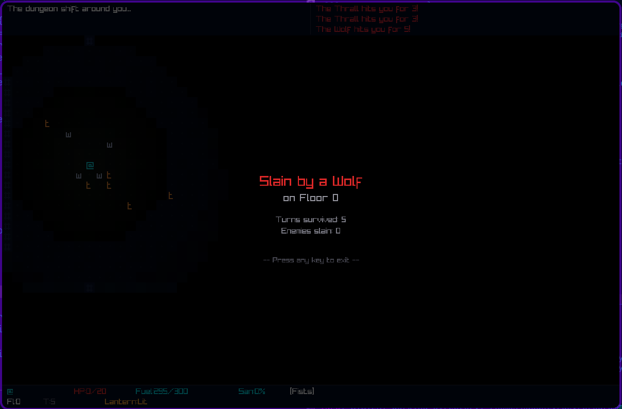The lantern fuel system, sanity spiral, and darkness-as-resource worked but were rushed and ultimately as time went on i felt like i was pulling more from IA than i intended to. and the brogue systems that i wanted weren't able to be implemented. One main gameplay feature that i entirely had to cut is the one i wanted to play around with the most, but that will have to wait until the real game gets further along.